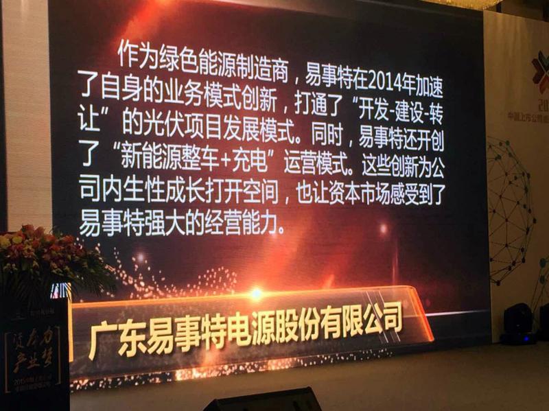 評委會認(rèn)為,作為全球綠色能源制造商,易事特在2014年加速了自身的業(yè)務(wù)模式創(chuàng)新,打通了“開發(fā)-建設(shè)-轉(zhuǎn)讓”的光伏項目發(fā)展模式。同時易事特還開創(chuàng)了“新能源整車+充電”運營模式,這些創(chuàng)新為公司內(nèi)生性成長打開空間,也讓資本市場感受到了易事特強大的經(jīng)營能力。