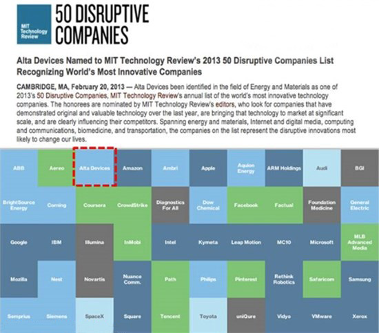 Alta Devices曾在2012年、2013年連續(xù)被全球歷史最悠久的科技商業(yè)雜志MIT TEChnology Review(麻省理工學(xué)院《科技創(chuàng)業(yè)》)評(píng)為“全球最具顛覆性創(chuàng)新公司”,與Google、IBM、Intel、微軟、三星等世界知名企業(yè)共同上榜。
