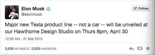 特斯拉首席執(zhí)行官Elon Musk發(fā)布推特稱,特斯拉全新產(chǎn)品線——不是汽車——將于4月30日周四晚8點(diǎn)在我們的Hawthorne Design Studio公布。 這看來(lái)充滿懸疑色彩的預(yù)告事實(shí)上很可能是特斯拉家用電池。 今年2月,Musk曾表示