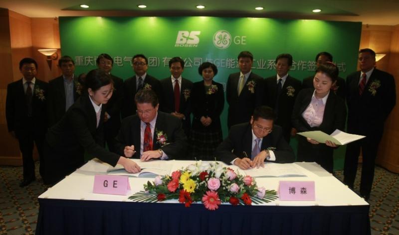 2010年11月3日,GE工業(yè)系統(tǒng)在重慶與重慶博森電氣(集團(tuán))有限公司以及重慶機(jī)電控股下屬的關(guān)聯(lián)體簽署合作備忘錄,將在重慶成立一家中外合資企業(yè)。重慶市副市長童小平,重慶市國資委,發(fā)改委,經(jīng)信委及外經(jīng)委的相關(guān)領(lǐng)導(dǎo)蒞臨現(xiàn)場,對此項(xiàng)合作表達(dá)了密切關(guān)注與熱烈祝賀。GE工業(yè)系統(tǒng)亞太區(qū)首席執(zhí)行官金飛翔及中國區(qū)總經(jīng)理王飚到訪重慶,參與了此次簽約儀式。
