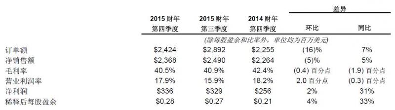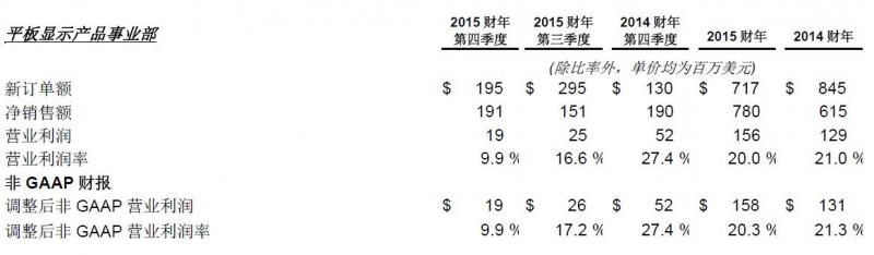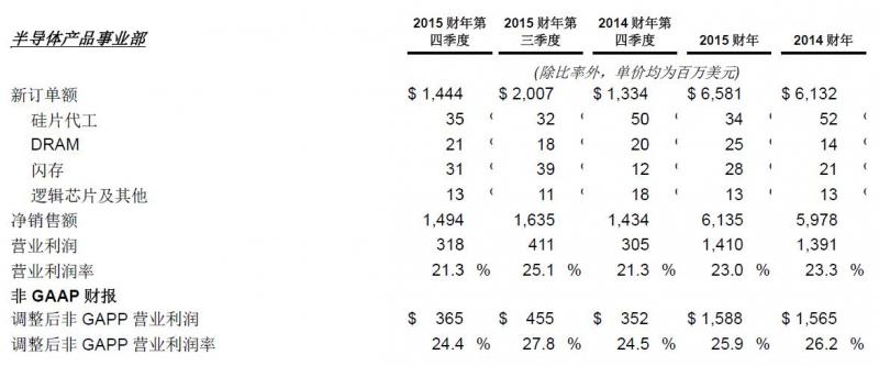 2015財(cái)年第四季度,應(yīng)用材料公司實(shí)現(xiàn)總訂單額24.2億美元,較上季度下滑16%,較上年同期上升7%。凈銷售額達(dá)23.7億美元,較第三季度下滑5%,較上年同期攀升5%。