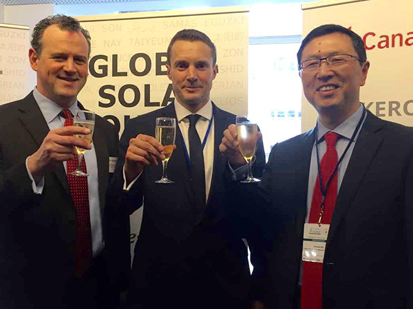 阿特斯陽光電力集團總裁瞿曉鏵博士(右)與全球太陽能理事會主席Bruce Douglas(中)、全球太陽能理事會秘書長John Smirnow(左一)