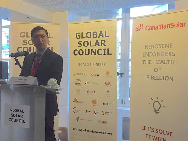 第二十一屆聯(lián)合國氣候變化大會(COP21)于2015年11月30日至12月11日在法國巴黎召開。阿特斯陽光電力集團總裁瞿曉鏵博士作為中國光伏企業(yè)代表,受邀參加了12月6日舉行的全球太陽能理事會(Global Solar Council,簡稱“GSC”)成立儀式和首屆董事會,并做主旨發(fā)言。