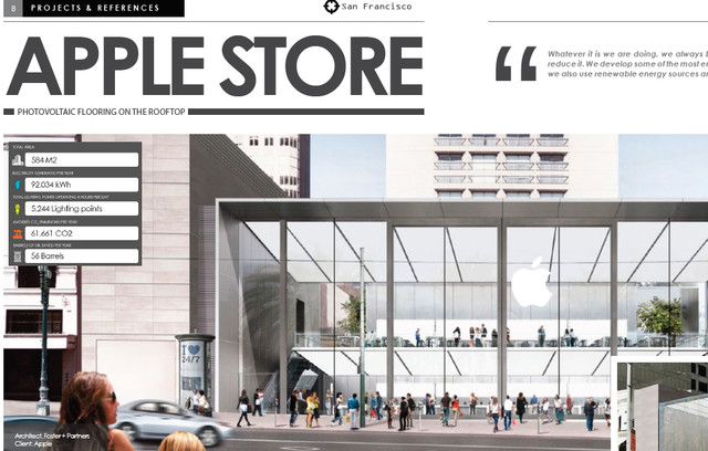 據(jù)外媒報道,蘋果已經(jīng)決定將在新建的零售店中采用全新的太陽能玻璃地板,消費者可以在上面行走,第一家使用這種技術的零售店是位于舊金山的Apple Store。