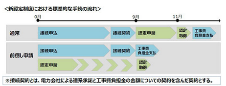 除此之外,在新認(rèn)證制度的申請(qǐng)手續(xù)方面規(guī)定,為了加快新認(rèn)證制度的申請(qǐng)流程,無(wú)論有沒(méi)有簽訂并網(wǎng)協(xié)議,都可以提前申請(qǐng)認(rèn)證。還有并網(wǎng)協(xié)議附帶的工程費(fèi)負(fù)擔(dān)金向電力公司的支付期限,原則上是簽訂協(xié)議之后的1個(gè)月內(nèi)。
