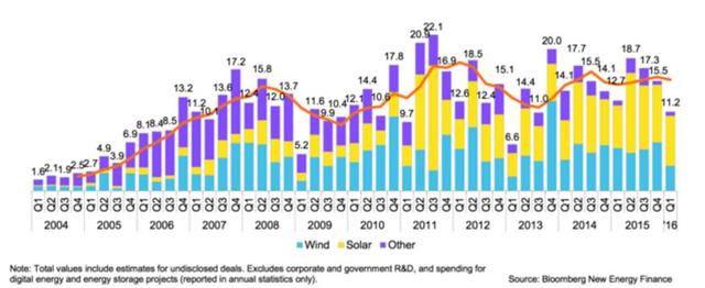 美國(guó)最近今年對(duì)太陽(yáng)能的投資日漸超過(guò)了風(fēng)能(表中數(shù)據(jù)單位為10億美元)