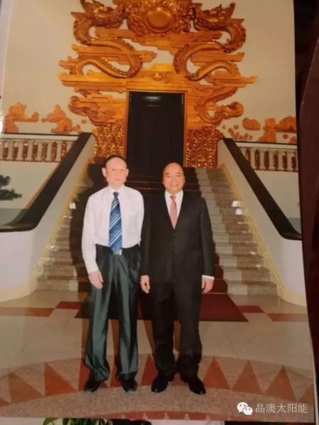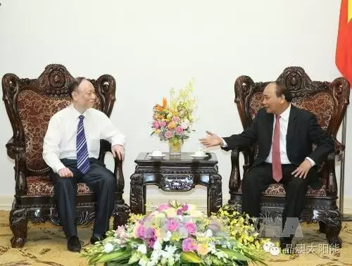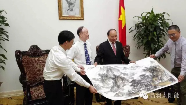 7月10日,晶澳太陽能董事長靳保芳、執(zhí)行總裁謝健以及副總裁臧文超到越南考察訪問。11日,越南總理阮春福在政府總部親切會見靳保芳一行。靳董事長代表晶澳太陽能向越方贈送了國畫。