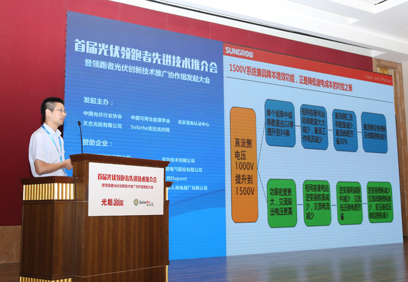 揭牌儀式后,陽光電源光儲事業(yè)部梅曉東經(jīng)理應(yīng)邀發(fā)表了主題為《iSolar智慧陽光解決方案先進(jìn)技術(shù)助您領(lǐng)跑》的精彩演講。梅曉東經(jīng)理強(qiáng)調(diào):“1500V系統(tǒng)與之前的系統(tǒng)相比,降本的同時又能起到了增效的作用,是降低LCOE的對癥之策。其代表了光伏領(lǐng)域系統(tǒng)的先進(jìn)技術(shù),也是未來主流趨勢!贝送猓窌詵|經(jīng)理還和大家分享了陽光電源大型水面電站智慧陽光解決方案,“在大型地面電站,水面光伏電站等無遮擋場合,集中式解決方案初始投資更低,陽光電源SG1250-MV集中式逆變器后期運(yùn)維成本僅是組串式的1/3,其中2.5MW/3MW的解決方案將成為主流。”