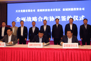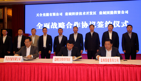 2016年11月12日,天合光能有限公司(下稱“天合光能”)與鹽城市國(guó)能投資有限公司(下稱“鹽城國(guó)能”)在江蘇鹽城經(jīng)濟(jì)開(kāi)發(fā)區(qū)簽訂了全面戰(zhàn)略合作協(xié)議。