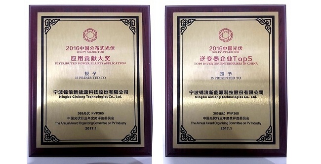 2017年1月6日-7日,PVP365在江蘇常州隆重舉辦“2016中國行業(yè)年會(huì)暨第四屆中國光伏行業(yè)年度頒獎(jiǎng)典禮”。錦浪科技憑借2016年度強(qiáng)勁的科技創(chuàng)新力和良好的業(yè)績表現(xiàn)榮膺“2016中國光伏逆變器企業(yè)TOP5”,憑借在分布式光伏系統(tǒng)中錦浪逆變器運(yùn)行的高可靠性榮獲“2016中國分布式光伏應(yīng)用貢獻(xiàn)大獎(jiǎng)”。