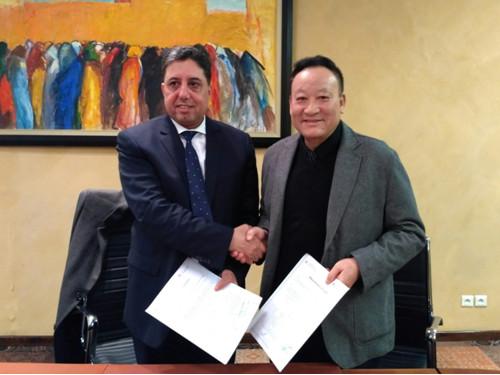圖:深圳市能聯(lián)電子有限公司曾祖勤(右)與摩洛哥蓋勒敏-塞馬拉自治區(qū)主席阿卜杜•拉赫姆•布阿德(左)交換協(xié)議書