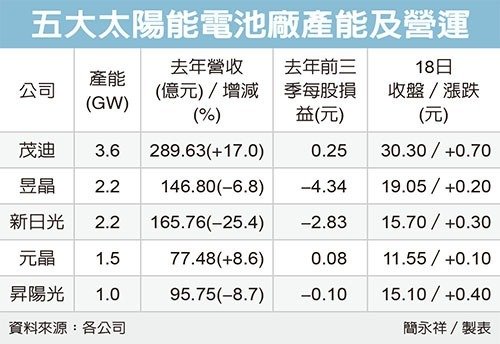 茂迪目前太陽能電池年產(chǎn)能為3.6GW、昱晶為2.2GW、新日光為2.2GW、元晶為1.5MW,升陽科為1GW。