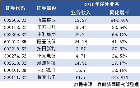 事實(shí)上,國(guó)內(nèi)諸多光伏企業(yè)借助“一帶一路”的東風(fēng),積極布局海外市場(chǎng)。以A股光伏企業(yè)為例,根據(jù)界面新聞的不完全統(tǒng)計(jì),包括協(xié)鑫集成(002506.SZ)、陽(yáng)光電源(300274.SZ)、隆基股份(601012.SH)等國(guó)內(nèi)光伏產(chǎn)業(yè)鏈各環(huán)節(jié)的龍頭企業(yè)在內(nèi),共有9家A股光伏企業(yè)成為“一帶一路”光伏概念股。而從上述公司2016年的境外業(yè)績(jī)來(lái)看,8家企業(yè)去年的境外收入實(shí)現(xiàn)增長(zhǎng)。
