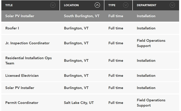 從官網(wǎng)信息來看,Solarcity招聘包括太陽能電池板安裝專員、屋頂安裝專員、檢查協(xié)調(diào)人員、電工、水泥修補專員甚至光伏設(shè)計師等多個崗位,招聘地點也涵蓋了加利福尼亞州、德克薩斯州、賓夕法尼亞州、紐約州、內(nèi)華達州、新澤西州、新墨西哥州、馬薩諸塞州、佛羅里達州、亞利桑那州等多個美國地區(qū),并且所有崗位的工作類型都是全職。