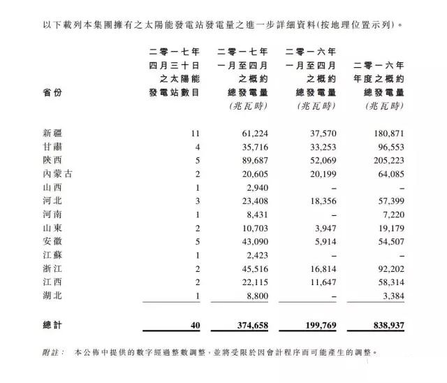 5月16日,從事投資及營運(yùn)太陽能發(fā)電項目的江山控股有限公司(「江山控股」或「公司」,連同其附屬公司統(tǒng)稱「集團(tuán)」,港交所股份代碼:295)欣然公布,根據(jù)集團(tuán)現(xiàn)有之初步營運(yùn)統(tǒng)計數(shù)據(jù),集團(tuán)擁有之太陽能發(fā)電站于2017年1月至4月之總發(fā)電量約為374,658兆瓦時(「兆瓦時」),較去年同期的約199,769兆瓦時