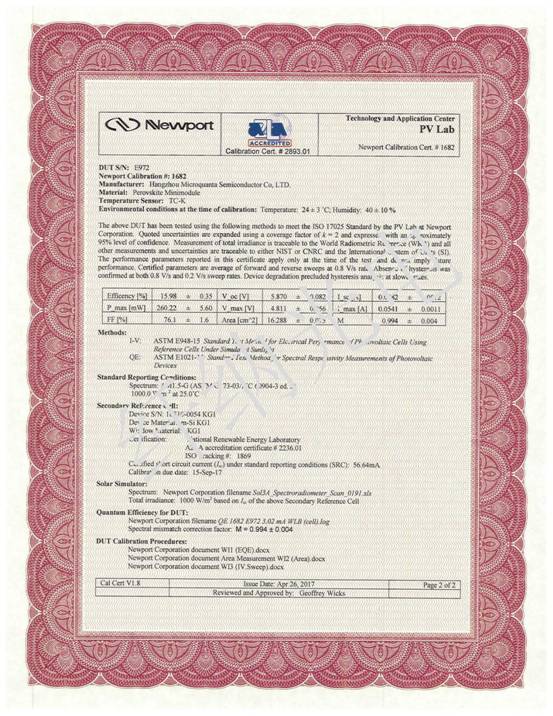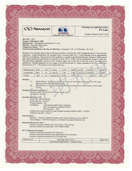 目前,該成果已獲得位于美國蒙大拿州的國際測試中心Newport公司的權(quán)威認(rèn)證。Newport實(shí)驗(yàn)室是全球六家被認(rèn)可的效率認(rèn)證機(jī)構(gòu)之一。