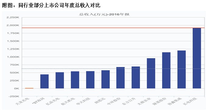 天龍光電2016年年報(bào)披露,公司營業(yè)總收入為15005.48萬元,相較同行業(yè)(半導(dǎo)體與半導(dǎo)體生產(chǎn)設(shè)備行業(yè))的其它上市公司,天龍光電2016年總收入在51家公司中僅排在第48位,收入情況不僅遠(yuǎn)低于排名第1 位的191.23億元,且即使與高于自己排名1位的公司營收23890.53萬元相比,也有很大差距(見附圖),然而就在天龍光電營收表現(xiàn)平平的背景下,公司的凈利潤和毛利率數(shù)據(jù)的變化卻是非常驚人的。