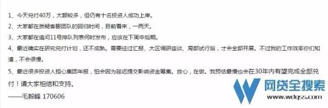 林然告訴記者,6月7日,毛毅峰還曾在其中一個官方投資群表示,從6月7日起算,未來十個工作日內(nèi)暫停兌付,因為有全員方案將會推出,公司要在后臺數(shù)據(jù)無變化的情況下進行統(tǒng)計、測算,最終明確方案細節(jié),十個工作日后會有明確方案出臺。聽聞此消息后,投資者們一陣狂轟濫炸,質(zhì)疑為何暫停兌付。最后,毛毅峰作出妥協(xié),6月7日繼續(xù)兌付。