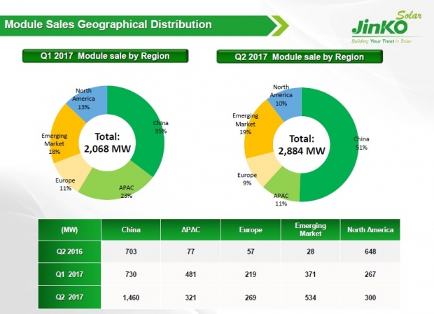 “中國市場在季度內(nèi)的需求受到6月30日上網(wǎng)電價(jià)補(bǔ)貼調(diào)整而導(dǎo)致的訂單增長的促進(jìn)而十分強(qiáng)勁。這一勢頭將憑借領(lǐng)跑者項(xiàng)目、光伏扶貧項(xiàng)目和分布式光伏項(xiàng)目所帶來的穩(wěn)定市場需求而持續(xù)至第三季,并預(yù)計(jì)可持續(xù)至全年。中國市場的長期需求將通過國家能源局不斷上調(diào)的五年計(jì)劃目標(biāo)而獲得支撐。美國市場上的201條款貿(mào)易案為市場帶來了不穩(wěn)定性。我們?nèi)耘f對美國市場充滿信心,并相信該市場的長期增長態(tài)勢將不會被改變。新興市場上的需求也出現(xiàn)了持續(xù)增長,在季度內(nèi)的總出貨量中占到了很大部分。印度市場制定的2022年前實(shí)現(xiàn)100GW安裝量的目標(biāo)十分見識,并將持續(xù)為市場發(fā)展創(chuàng)造強(qiáng)勁的需求。墨西哥、阿根廷和巴西等拉美市場的太陽能市場也出現(xiàn)了大規(guī)?焖僭鲩L,同時(shí),埃及和約旦等中東市場有望在明年達(dá)到吉瓦級別。我們預(yù)計(jì)新興市場上的需求將在2018年持續(xù)增長。”陳先生補(bǔ)充道。