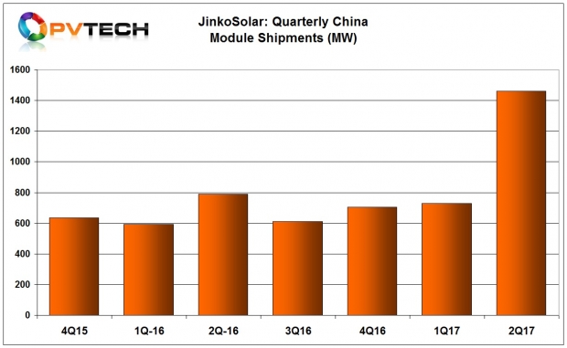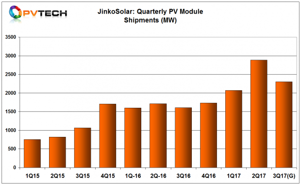 晶科能源正式,其在2017年三季度內(nèi)的太陽能組件產(chǎn)品出貨量預(yù)期值在2.1GW-2.3GW的范圍內(nèi)。公司管理層在業(yè)績電話會議上表示,公司希望能夠?qū)崿F(xiàn)更靠近預(yù)測范圍上端的出貨量水平。