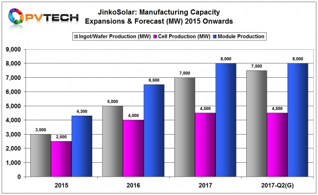 光伏組件產(chǎn)能在2017年二季度內(nèi)增加了1GW,達(dá)到7.5GW。組件產(chǎn)能預(yù)計(jì)將在三季度內(nèi)進(jìn)一步增加500MW,同時(shí),年底前沒有內(nèi)部自產(chǎn)產(chǎn)能擴(kuò)張的計(jì)劃?偨M件產(chǎn)能預(yù)計(jì)將為8GW。