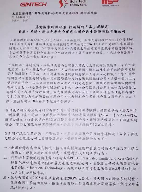 昱晶(3514)、升陽光(3561)、新日光(3576)等三家臺灣太陽能公司于10月16日下午共同宣布,為因應(yīng)太陽能產(chǎn)業(yè)高度競爭的態(tài)勢與挑戰(zhàn),各公司董事會業(yè)已于今日上午分別決議通過簽署“合并意向書”,表達(dá)合意推動三家公司合并為一家公司之計劃! £啪茉、升陽光電、新日光皆為臺灣各具特色之太陽能電池制造商,深耕太陽能產(chǎn)業(yè)十余年
