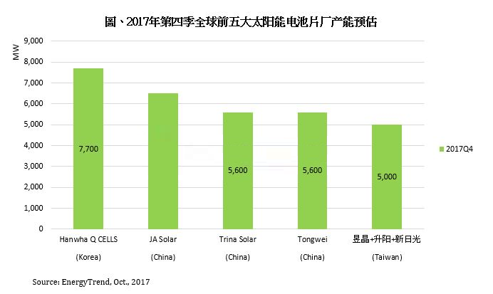 昱晶能源、升陽光電和新日光等三家臺灣光伏廠于10月16日宣布簽訂合并意向書,成立“聯(lián)合再生能源股份有限公司”,預(yù)計在2018年第三季完成合并案。集邦咨詢新能源研究中心(EnergyTrend)預(yù)估,合并后的電池片總產(chǎn)能將達到5GW,包括在臺灣地區(qū)的3.5GW以及在泰國、越南及中國大陸共約1.5GW,一躍成為全臺最大、全球第五的電池片制造商。若單論電池片對外供應(yīng)能力,則是全球第二。