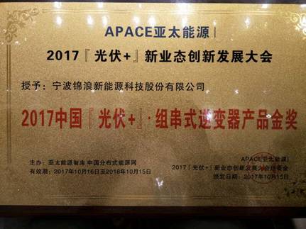 大會(huì)在10月15日上午舉行了開(kāi)幕式,并公布了APACE亞太能源2017『光伏+』新業(yè)態(tài)創(chuàng)新發(fā)展大會(huì)總評(píng)榜獲獎(jiǎng)企業(yè)名單。在此次獎(jiǎng)項(xiàng)評(píng)選中,錦浪科技再次展現(xiàn)作為逆變器生產(chǎn)研發(fā)上的雄厚實(shí)力——一舉斬獲 “2017『光伏+』·最佳元素獎(jiǎng)”。
