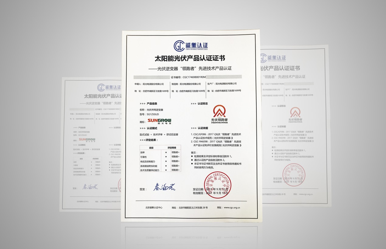 經(jīng)過嚴(yán)格的“型式試驗(yàn)+技術(shù)評審+獲證后監(jiān)督”認(rèn)證,近日,鑒衡認(rèn)證中心(CGC)向陽光電源戶外集中逆變器SG1250UD頒發(fā)了首張“5★”級光伏逆變器“領(lǐng)跑者”先進(jìn)技術(shù)產(chǎn)品認(rèn)證證書,五項(xiàng)“領(lǐng)跑者+”的評定,再次印證了陽光電源在全球逆變器領(lǐng)域的領(lǐng)先優(yōu)勢。