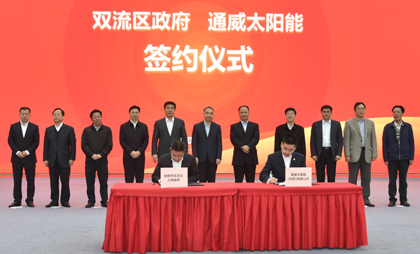 11月18日上午,通威太陽能成都基地10GW高效晶硅電池項目簽約暨啟動儀式在成都市雙流區(qū)隆重舉行。中共四川省委常委、成都市委范銳平書記,中共成都市委副書記、市政府羅強市長,中共成都市委常委、茍正禮秘書長,成都市政府范毅副市長,成都市市長助理、市政府韓春林秘書長,中共成都市委何軍副秘書長,中共雙流區(qū)
