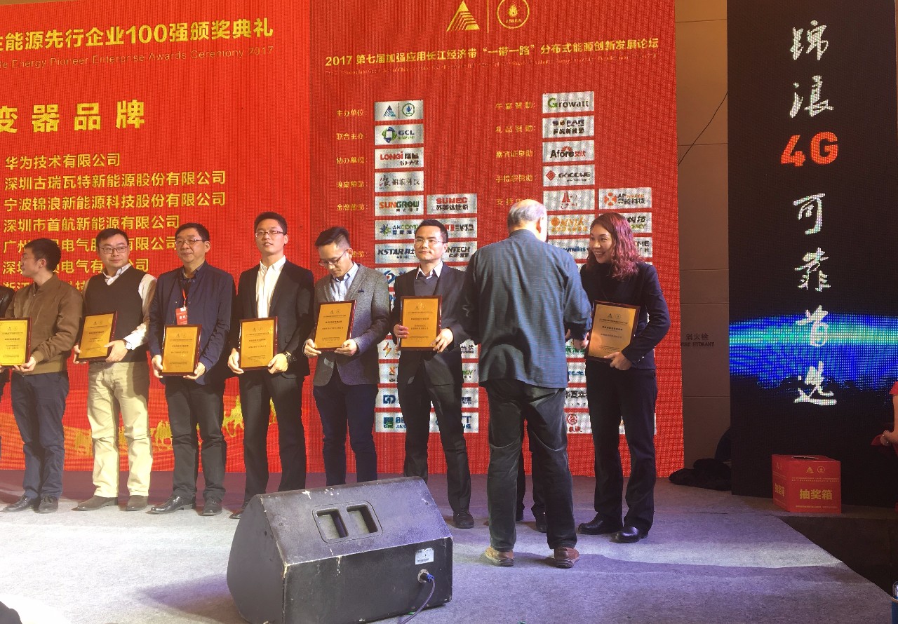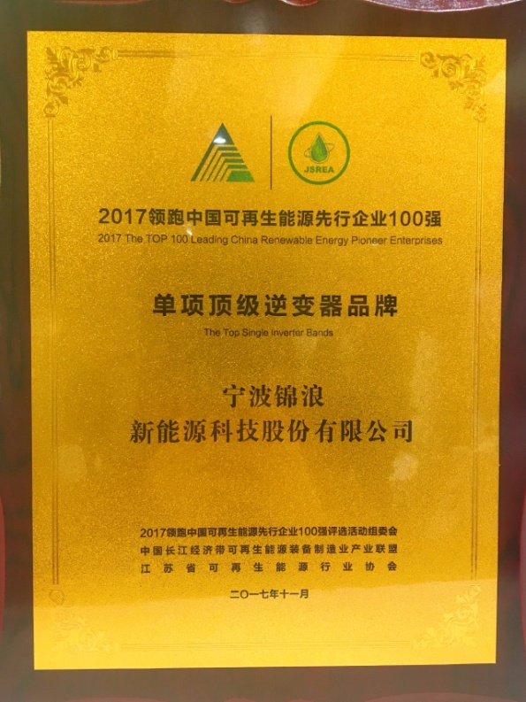 24日晚,在同期舉辦的分布式創(chuàng)新發(fā)展論壇 “錦浪之夜”主題晚宴暨2017領跑中國可再生能源先行企業(yè)第一軍團100強及優(yōu)秀企業(yè)家頒獎典禮上, 2017領跑中國可再生能源先行企業(yè)100強-單項頂級品牌頒獎典禮舉辦。錦浪科技成功入選,榮獲“單項頂級逆變器品牌獎”。