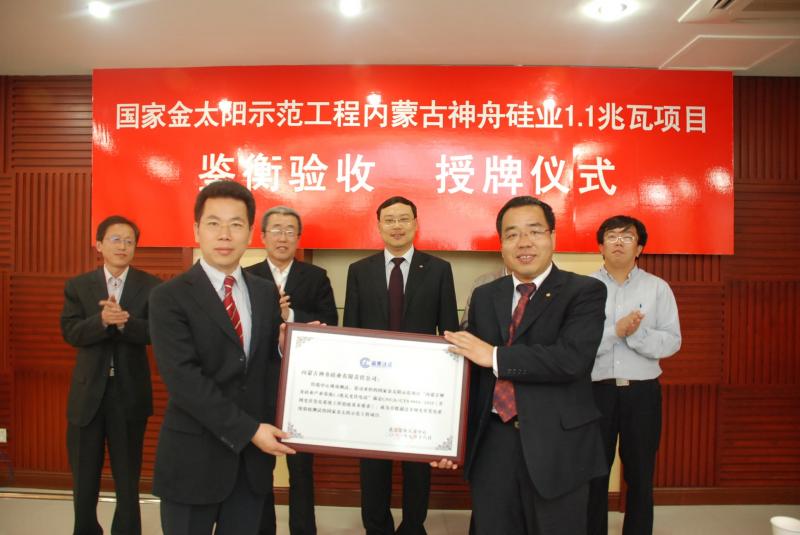 北京鑒衡認證中心主任萬琳,內(nèi)蒙古自治區(qū)發(fā)改委新能源和可再生能源處趙康喜、科技廳高新處胡和生處長,八院副院長、航天機電董事長姜文正,內(nèi)蒙古神舟硅業(yè)總經(jīng)理張耀平、上海太陽能科技有限公司副總經(jīng)理呂玉龍等領(lǐng)導出席了本次驗收授牌儀式。