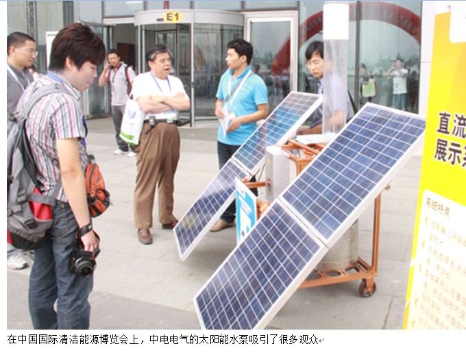 “這是什么啊?”日前,在中國(guó)國(guó)際清潔能源博覽會(huì)上,中電電氣集團(tuán)展臺(tái)上一套獨(dú)特的裝置引來(lái)許多好奇觀眾。這是一套太陽(yáng)能水泵系統(tǒng),一個(gè)太陽(yáng)能發(fā)電裝置加一個(gè)水泵,就可以在沒(méi)有外接電源的情況下不斷把井底的水提上來(lái),用于灌溉或是飲用,這對(duì)于那些電網(wǎng)尚不發(fā)達(dá)的山區(qū)或是沙漠來(lái)說(shuō),是莫大的福音。據(jù)悉,這套太陽(yáng)能水泵系統(tǒng)是由中電電氣(南京)太陽(yáng)能研究院開(kāi)發(fā)的,8月份即將實(shí)現(xiàn)量產(chǎn),且可以根據(jù)用戶的需求進(jìn)行個(gè)性化定制。