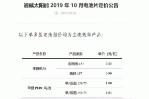 26日,通威太陽能發(fā)布10月電池片定價公告,其中,多晶電池金剛線157每瓦0.85元,多晶電池黑硅157每瓦0.9元,單晶PERC電池單/雙面156.75、單/雙面158.75單價分別為1元每瓦和1.03元每瓦,與九月份定價保持不變。