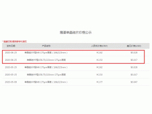 6月25日,隆基發(fā)布最新單晶硅片價(jià)格公示,單晶硅片P型M6 175μm厚度(166/223mm),價(jià)格為2.62元/片,單晶硅片P型158.75/223mm 175μm厚度,價(jià)格2.53元/片。