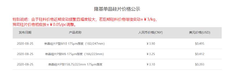 今日(8月25日),隆基官網(wǎng)公布了最新單晶硅片價格: