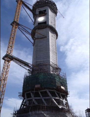 八達(dá)嶺太陽能熱發(fā)電試驗(yàn)電站吸熱塔工程是亞洲首座MW(兆瓦)級(jí)太陽能塔式熱發(fā)電技術(shù)應(yīng)用項(xiàng)目,為國(guó)家科技部“十一五”863重點(diǎn)項(xiàng)目,由中國(guó)科學(xué)院電工研究所承擔(dān)研究建設(shè)任務(wù)。該項(xiàng)目位于北京市延慶縣八達(dá)嶺鎮(zhèn)大浮陀村西,距延慶縣7km,東臨八達(dá)嶺告訴公路,建筑面積2536.16平米,地下一層,地上八層,總高119.45米,基礎(chǔ)采用人工挖孔灌注樁,主體結(jié)構(gòu)為鋼筋混凝土框架-筒體結(jié)構(gòu),外裙呈三維旋轉(zhuǎn)筒造型,內(nèi)筒采用400厚混凝土豎向筒體結(jié)構(gòu)。其建筑風(fēng)格與八達(dá)嶺景區(qū)的風(fēng)貌融為一體,設(shè)計(jì)理念充分融入了中國(guó)傳統(tǒng)文化和八達(dá)嶺長(zhǎng)城文化特點(diǎn),外形被設(shè)計(jì)成“如少女?dāng)[動(dòng)的裙擺”,極具藝術(shù)性和美觀性,尤其是60米一下擺動(dòng)的外裙柱板和60米以上內(nèi)筒向外傾斜的設(shè)計(jì)思路,將整體構(gòu)筑物勾勒得非常優(yōu)美,充分體現(xiàn)出混凝土結(jié)構(gòu)給人們帶來的另一番美的感受。