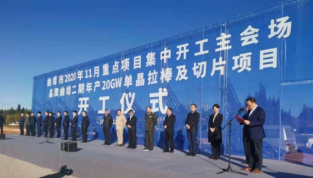 11月18日,晶澳曲靖基地二期年產(chǎn)20GW單晶拉棒及切片項(xiàng)目隆重開工。曲靖市委副書記、市長(zhǎng)李石松等領(lǐng)導(dǎo)出席開工儀式,晶澳科技董事、執(zhí)行總裁牛新偉致辭。