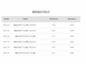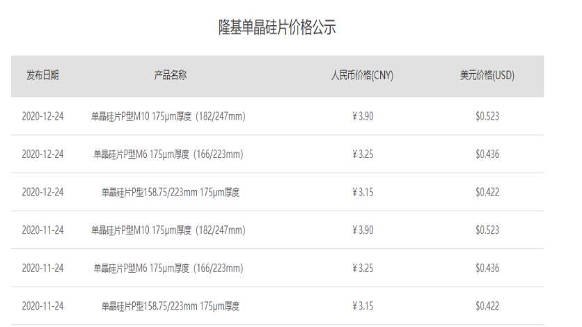 12月24日,隆基股份公布新一期硅片價格。國內(nèi)M6(166mm)、M10(182mm)、G1(158.75mm)尺寸硅片報(bào)價保持不變,分別為每片3.25元/片、3.90元/片、3.15元/片,定價較上一期持平。海外市場,G1、M6、M10尺寸硅片最新價格為每片0.422美元、0.436美元、0.523美元,價格維持穩(wěn)定。