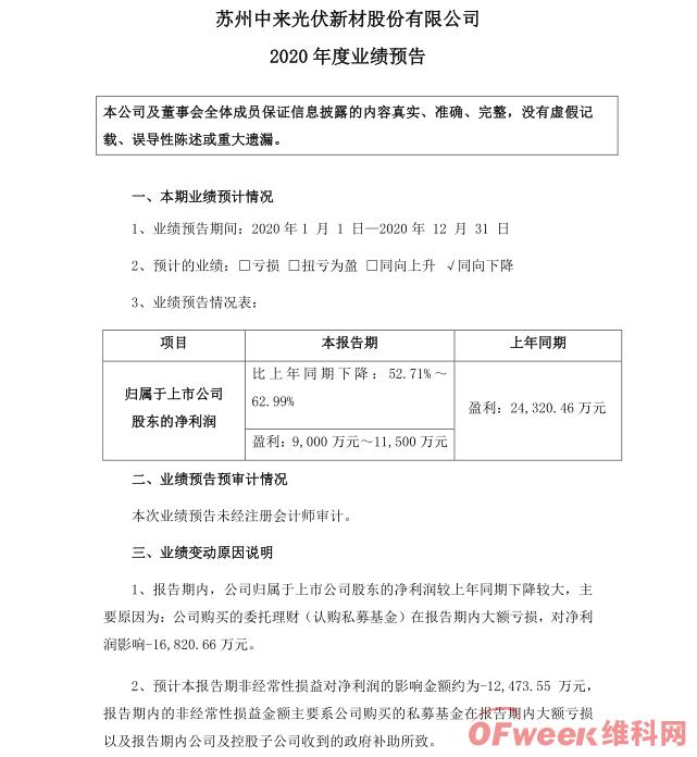 1月11日,蘇州中來光伏新材股份有限公司發(fā)布2020年度業(yè)績預(yù)告。