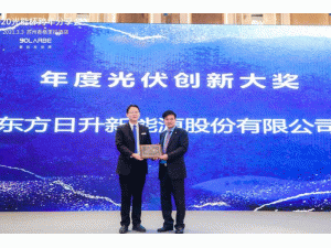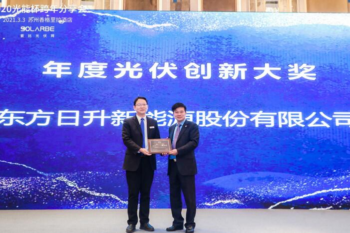 3月3日,2020年度“光能杯”分享會暨頒獎典禮在蘇州隆重舉行,東方日升新能源股份有限公司(簡稱“東方日升”)擷取了“年度光伏創(chuàng)新大獎”,以及由索比光伏網和鑒衡認證聯(lián)合頒發(fā)的“最具影響力光伏組件企業(yè)——創(chuàng)新突破先鋒獎”,企業(yè)實力再獲行業(yè)認可。