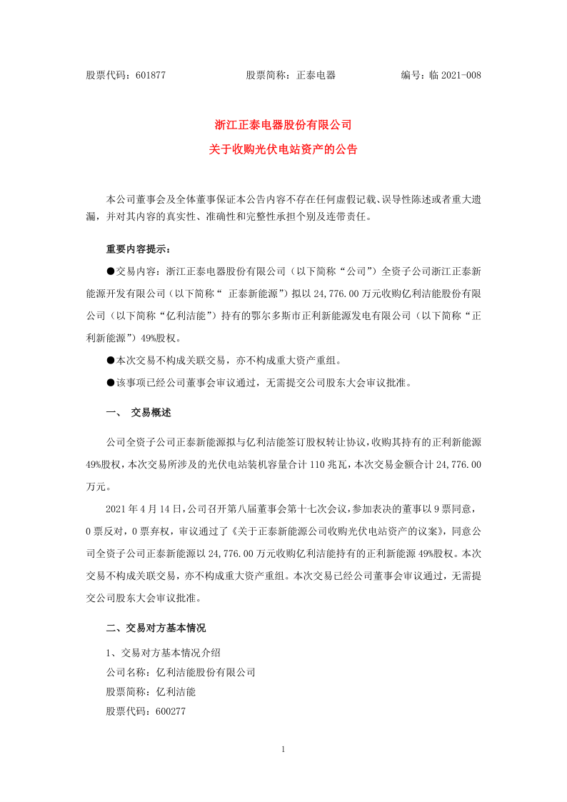 4月15日晚間,正泰電器發(fā)布公告稱,公司全資子公司正泰新能源擬與億利潔能簽訂股權(quán)轉(zhuǎn)讓協(xié)議,收購其持有的正利新能源49%股權(quán),本次交易所涉及的光伏電站裝機容量合計110兆瓦,本次交易金額合計約2.48億元。