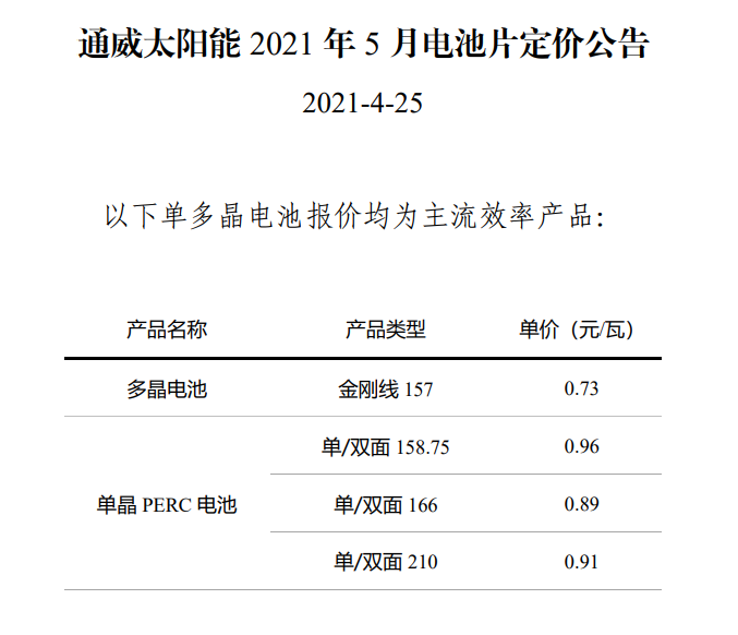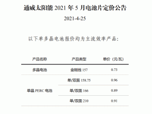 4月25日,通威官網(wǎng)發(fā)布5月電池片定價(jià)公告,多晶電池金剛線157定價(jià)0.73元/W,較上月0.7元/W上漲0.03元/W。單晶PERC電池片定價(jià)不變,其中,158.75單晶單/雙面PERC電池片定價(jià)0.96元/W;166單晶單/雙面PERC電池片定價(jià)0.89元/W;210單晶單/雙面PERC電池片定價(jià)0.91元/W。