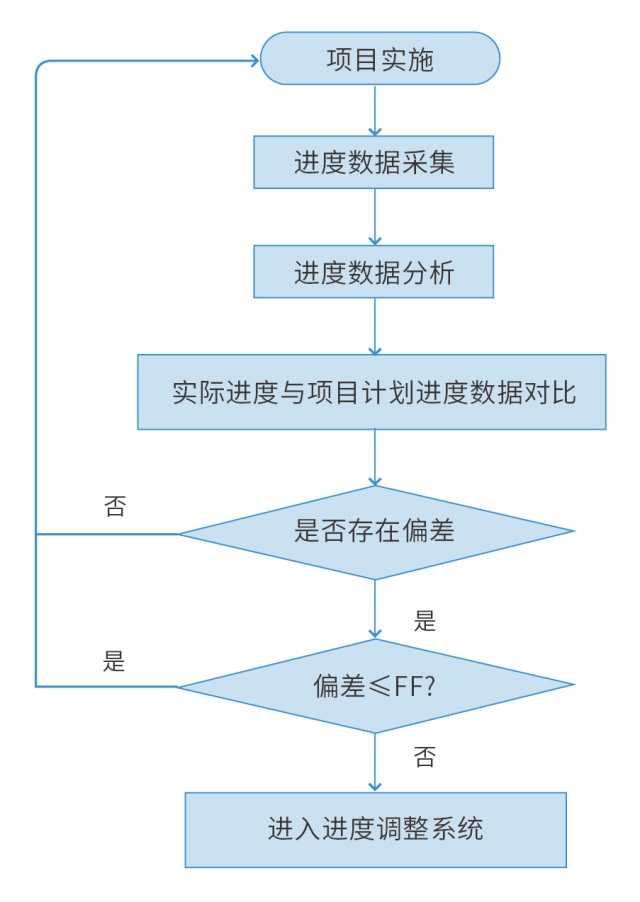當(dāng)發(fā)現(xiàn)項(xiàng)目的實(shí)際進(jìn)度和計(jì)劃的進(jìn)度不相符合,尤其是項(xiàng)目的實(shí)際進(jìn)度落后于計(jì)劃進(jìn)度時,必須認(rèn)真探究偏差以及產(chǎn)生偏差的原因,計(jì)算其對項(xiàng)目后續(xù)工作的影響,即產(chǎn)生的偏差與該項(xiàng)工作的工作自由時差(FF)的大小進(jìn)行對比,若對項(xiàng)目的后續(xù)工作產(chǎn)生了影響,則應(yīng)采取應(yīng)對措施,調(diào)整施工進(jìn)度,保證光伏發(fā)電項(xiàng)目的按時完成。項(xiàng)目的進(jìn)度檢測系統(tǒng)流程圖如下所示: