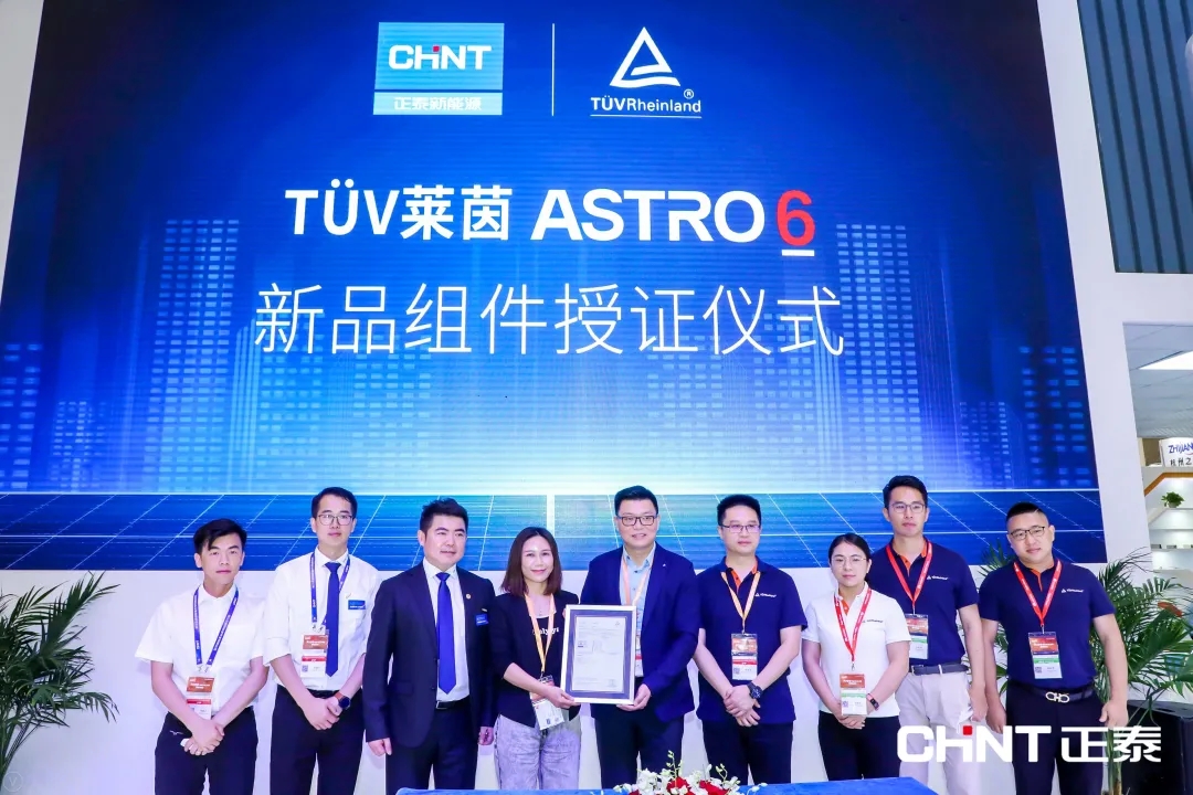 鄒馳騁為正泰ASTRO 6新品組件授證,TüV萊茵大中華區(qū)太陽能與商業(yè)產(chǎn)品服務(wù)太陽能組件總經(jīng)理章翊馳、項目部經(jīng)理郭愛娟,產(chǎn)品銷售部光伏組件及電站部經(jīng)理白益奇、太陽產(chǎn)品銷售部光伏組件客戶經(jīng)理徐海港,正泰新能源徐偉智、周盛永及質(zhì)量管理總監(jiān)鄭曉文等嘉賓共同見證。