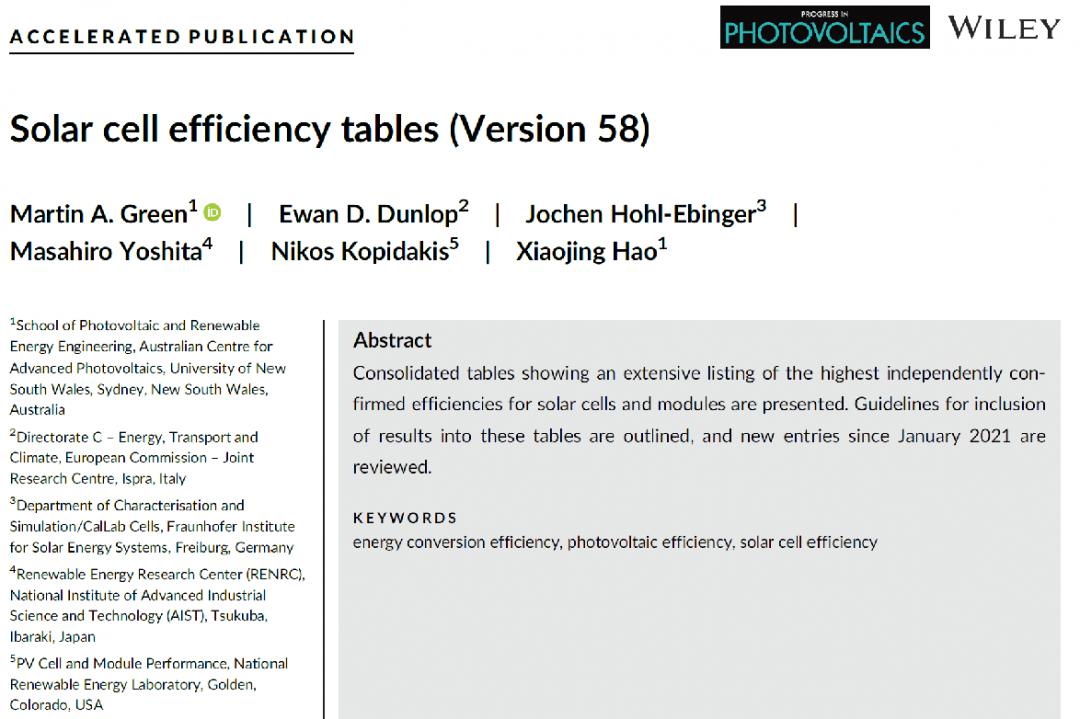 近日,被譽為“世界太陽能之父”的澳大利亞新南威爾士大學(xué)教授馬丁·格林撰寫的第58版《太陽能電池效率表》發(fā)布,隆基在6月初創(chuàng)造的商業(yè)尺寸N型TOPCon和HJT電池效率紀(jì)錄被該表格所收錄。