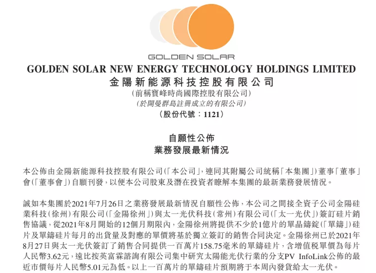 9月7日,金陽新能源科技控股有限公司(以下簡稱“金陽新能源”)公布業(yè)務(wù)發(fā)展最新情況!圖片來源:金陽新能源公告稱,公司間接全資子公司金陽硅業(yè)科技(徐州)有限公司(以下簡稱"金陽徐州")與太一光伏科技(常州)有限公司(以下簡稱"太一光伏")簽訂硅片銷售協(xié)議,從2021年8月開始的12個月期限內(nèi),金陽徐州將提供不少于1億片的單晶鑄錠("單鑄")硅片及