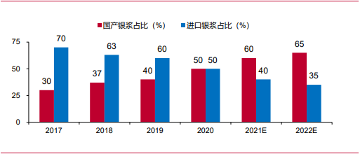 2017年起,國產(chǎn)銀漿市場份額加速提升,從2017年的20%,提升至2018年的35%-40%,到2020年的50%左右。2021年,國產(chǎn)漿料的市占率或達(dá)到60%以上。
