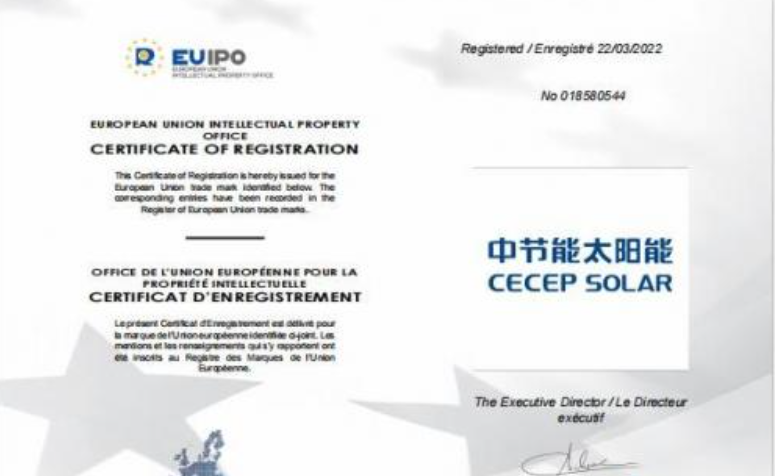 近日,鎮(zhèn)江公司“中節(jié)能太陽能CECEP SOLAR”商標(biāo)在歐盟、日本注冊(cè)成功,這標(biāo)志著鎮(zhèn)江公司在品牌發(fā)展的道路上又邁出了堅(jiān)實(shí)的一步,對(duì)擴(kuò)大品牌海外影響力,奠定了堅(jiān)實(shí)基礎(chǔ)。