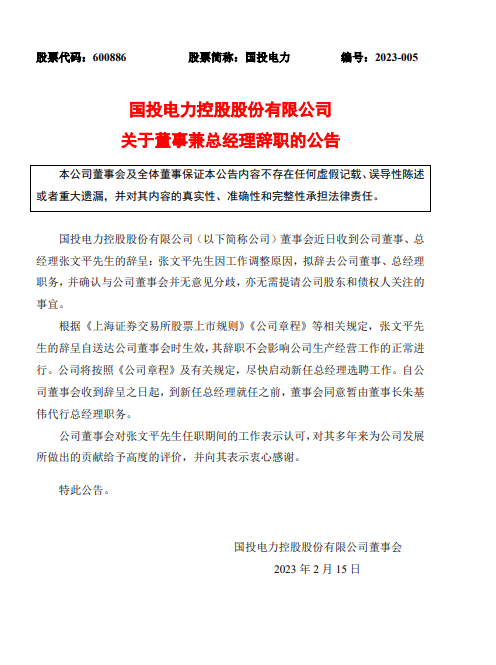 2月15日,國(guó)投電力發(fā)布關(guān)于董事兼總經(jīng)理辭職的公告,公告表示,董事會(huì)近日收到公司董事、總經(jīng)理張文平的辭呈:張文平因工作調(diào)整原因,擬辭去公司董事、總經(jīng)理職務(wù),并確認(rèn)與公司董事會(huì)并無意見分歧,亦無需提請(qǐng)公司股東和債權(quán)人關(guān)注的事宜。